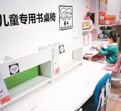 在江苏无锡,小朋友在体验儿童专用书桌椅。 |