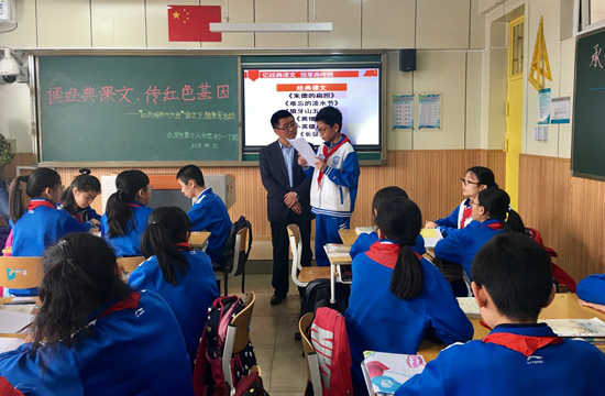 人民网北京4月19日电(孙竞)春意融融,书声琅琅。日前,一堂以“诵经典课文 传红色基因”为主题的语文班会活动在北京市第十八中学左安门分校初一七班举行。从气势磅礴的《七律·长征》、《黄河颂》,到悲壮感人的《狼牙山五壮士》《小英雄雨来》,语文课本中那些耳熟能详的英雄故事,在同学们深情的诵读中变得愈发鲜活、生动。