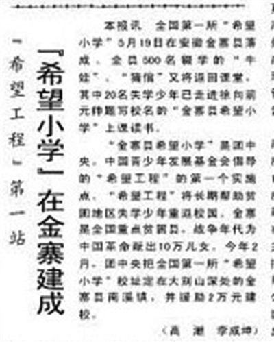 1990年5月19日,全国第一所“希望小学”在安徽省金寨县落成。5月22日,人民日报《“希望工程”第一站 “希望小学”在金寨建成》(图①,资料图片)的报道中这样写道:“‘金寨县希望小学’是团中央、中国青少年发展基金会倡导的‘希望工程’的第一个实施点。‘希望工程’将长期帮助贫困地区失学少年重返校园。”自此,希望小学如雨后春笋般出现在中国大地上,为教育落后地区和当地贫困学子打开了通向希望的大门。