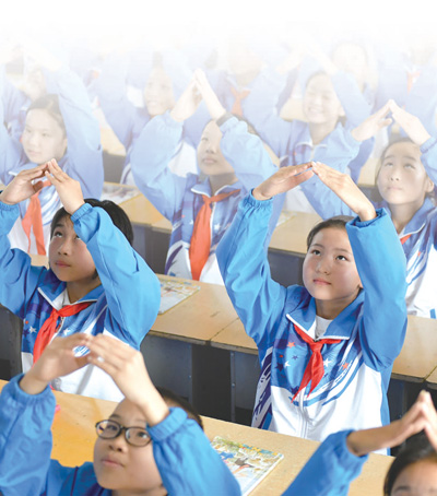 金寨县希望小学的孩子们做手语操。 |