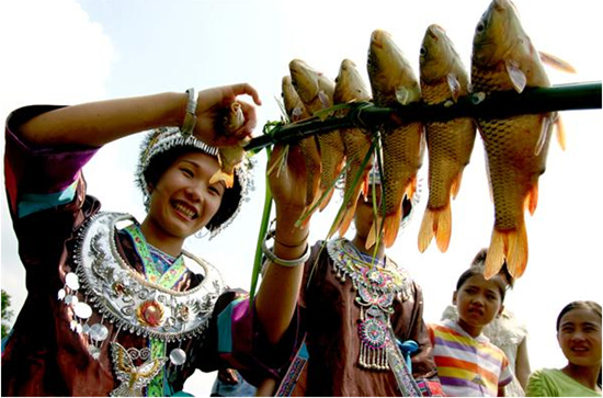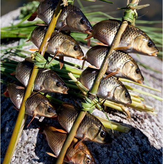苗家人吃鱼的方法有煮、炒、腌酸、晾干等,而最具风味的要数用火炭烧烤至熟,味道以鲜、美、嫩、香、甜为特色,而且吃法也新颖别致,饶有情趣。