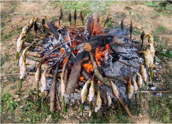 烧鱼是广西融水苗胞的习俗之一,融水的苗族同胞素有在稻田里养鱼的习惯,每年春插,苗家人向来喜欢在稻田里放养鲤鱼。每年的秋收稻黄时节也是田鲤肥壮之时,这时来自四乡八寨众多的各民族兄弟便汇聚起来,点燃一堆堆篝火,烧田鲤吃野餐,尽享丰收喜悦。烧鱼从9月稻黄收割开始持续到12月底才正式结束,故名“元宝山金秋烧鱼季”。烧鱼季节,苗寨家家户户酿起醇浓的甜酒,蒸着香喷喷的糯米饭,带上食盐、辣椒、蒜苗、葱花、薄荷等佐料上山去剪禾。晌午时候,他们在田头或田边的平地烧起一堆堆篝火,从田里抓来一笼笼活蹦乱跳的鲤鱼,用树枝或竹片把鱼一条条串起,排成一排,然后放在红彤彤的火炭上翻来覆去地烤,大约半小时左右,鱼被烤炙得“呲呲”作响,水分烤干,慢慢地变黄,直至熟透,香飘四溢,远远就可闻到香味。
