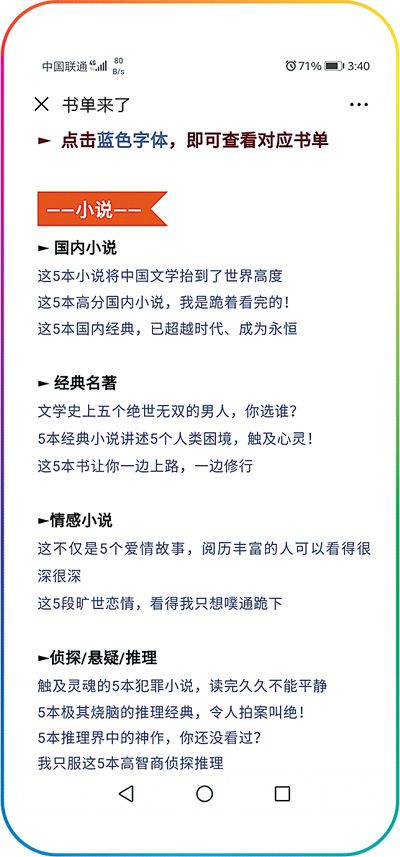 从2016年到2018年,主打美文分享的“人民文学出版社”公众号连续三届荣登“大众喜爱的50个阅读公众号”榜单。对于这个公众号的运营,人民文学出版社策划部主任宋强表示,“人民文学出版社”公众号推送的文章非常注重可读性,都是精心挑选的名家名篇。公众号还发布了小程序“人文读书声”,读者可以在上面收听到世界文学名著的有声书,得到视觉和听觉的双重享受。在为读者提供有价值的阅读的同时,公众号还时常回馈给读者一些小福利,宋强说:“我们有时会通过微店,为热心读者提供一些带有作家亲笔签名的书籍版本。”