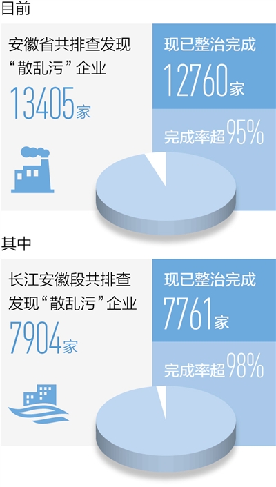 目前,安徽省共排查发现“散乱污”企业13405家,现已整治完成12760家,完成率超过95%,包括整顿规范3807家、取缔关闭8953家。其中长江安徽段共排查发现“散乱污”企业7904家,现已整治完成7761家,完成率超过98%,包括整顿规范2652家、取缔关闭5109家。