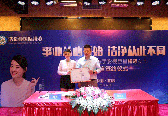 2017年6月10,洁希亚国际洗衣携手影视巨星梅婷女士品牌签约仪式落下帷幕,成功签约梅婷为2017品牌代言人。此次洁希亚国际洗衣与梅婷女士的强强联合是历史性的一刻,标志着洁希亚国际洗衣开启了全新的品牌阶段。今后双方将携手在品牌建设和品牌发展方面不断推陈出新,将洁希亚打造成为消费者信赖的首选品牌,将最优质的洗护服务带给大江南北的每一位顾客。