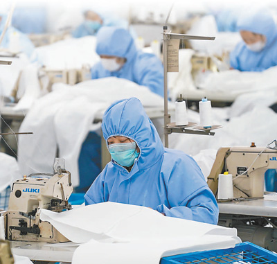 2月8日,江苏红豆集团工作人员在一般性防护服生产线上作业。 |