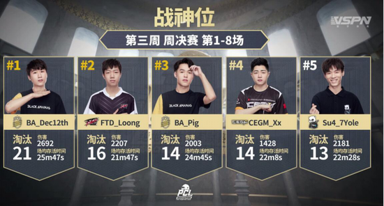 本周周决赛战神位BA选手十二月依靠21个淘汰数位列榜首,十二月在几波正面的房区防守战中都表现出色,帮助BA几次化险为夷,而FTD_Loong与BA_Pig则分列二三位