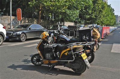 朝阳区现代城中路,一些送外卖车辆停放在机动车道上。