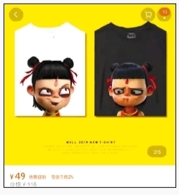北青报记者随机选取三家售卖T恤的店铺,看到三家店铺所销售的T恤上的卡通形象均与电影《哪吒之魔童降世》中的哪吒相同,T恤上的字体样式“哪吒”也与电影海报中相同,卖家可选择多种颜色和图案样式。在商品描述中,卖家写道“哪吒之魔童降世联名短袖”、“动画电影周边”。在其中一家店铺中,T恤上还印有电影台词,月销量有283件。