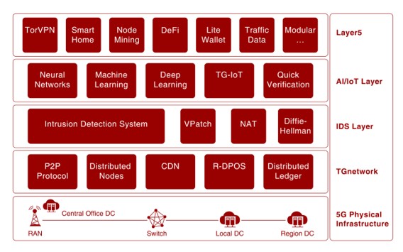 TGnetwork技术底层架构方面采用了很多的对用户友好的技术,以5G技术为基础保证整个网络的快速;区块链技术提供价值流转的解决方案;去中心化存储保证存储的安全性;IDS服务对整个网络的数据和网络做积极性的防护;人工智能让整个网络生态的Dapp服务更加高效;物联网技术提供整个生态的节点服务;TG隐私协议对用户的数据进行二次加密保护。