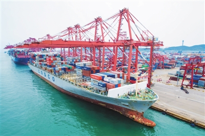 7月9日,山东青岛港外贸集装箱码头,货轮在装卸集装箱。 |