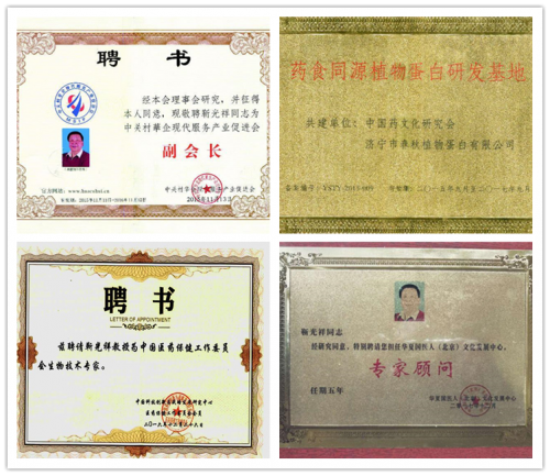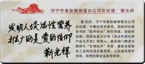 济宁市春秋植物蛋白公司总经理,《花生低温脱脂综合加工高新发明专利技术》拥有人、弱碱性复合功能活蛋白发明人、药食同源开拓者、著名的医养结合研究专家靳光祥教授,致力于人类健康进步,充分发挥药食同源的优势及作用,为人类不能治愈疾病攻坚克难,为保障和改善民生健康做出了独特贡献。