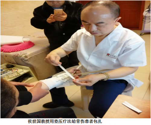 和临床骨伤治疗通常采用各种硬质固定材料相比,垫压条占用空间小、能随意弯曲,方便患者起居生活,搭配特制骨伤垫压膏,让患者伤势消肿止痛同时,也让其皮肤不受损害。近年来,侯世国先生不断完善“骨伤垫压疗法”,形成了一套完整的“软压垫+中药外用”治疗骨伤的体系。至今,用“中医骨伤垫压疗法”治愈了各类骨伤病人10万余例,临床有效率达98%。