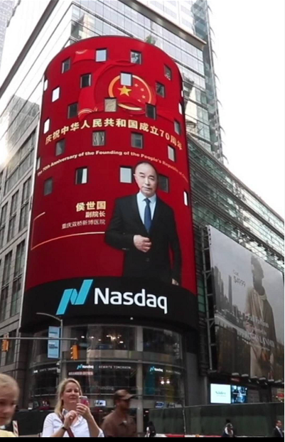 今年是新中国成立70周年,70年来中医药事业的崛起令人振奋,中医药人也用攻坚克难和自我革新的精神,紧跟时代步伐,攀登医学高峰。侯世国先生几十年呕心沥血、服务临床、言传身教培养人才、薪火传承开展研究、全心全意为民服务。为人类骨科健康事业贡献了中国处方。2019年10月1日,在举国同庆的日子里,作为中国中医药技术的创新者、,中医药文化的传承者,非物质文化遗产“骨伤垫压疗法”传承人侯世国荣登号称世界第一屏的纳斯达克大屏幕,与全球华人共庆新中国成立70周年! 祝愿祖国繁荣富强。