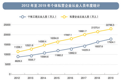 宽松便捷的市场环境鼓励众多创业者进入市场。截至2019年11月底,全国个体工商户达8162万户,私营企业达3468万户,全国个体私营从业人员达4.04亿人,呈现良好的发展态势。