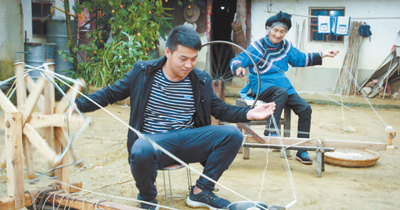 图为纪录片《传承》剧照。在云南省曲靖市马龙县咨卡村,年轻人李稳向火草纺织技艺传承人李桂兰请教织作技艺。 |
