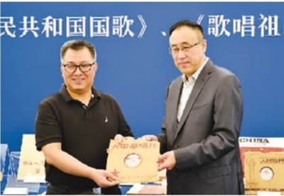 汪世林(右)向中国国家博物馆馆长王春法(左)捐赠首版《中华人民共和国国歌》唱片。周 缘 摄 |