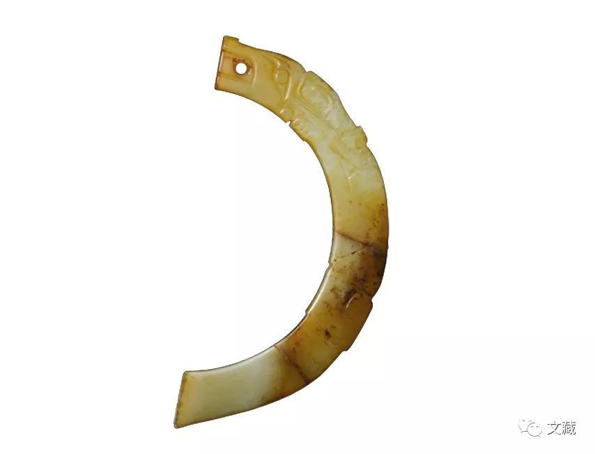 长8.3、宽0.2厘米。青白玉、玉质较为温润,局部有沁,表皮泛浅黄沁。器体为夔龙体呈璜形。夔龙一足。龙足露四爪,足前有小凸圆,二者之间有小凹界分。龙后体有较为明显的两个层次的界棱递薄递窄,尾端呈刀形。此器时代特征明显,应属西周早期。(图2)