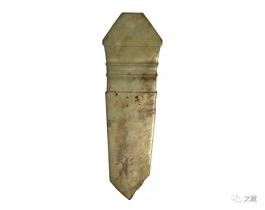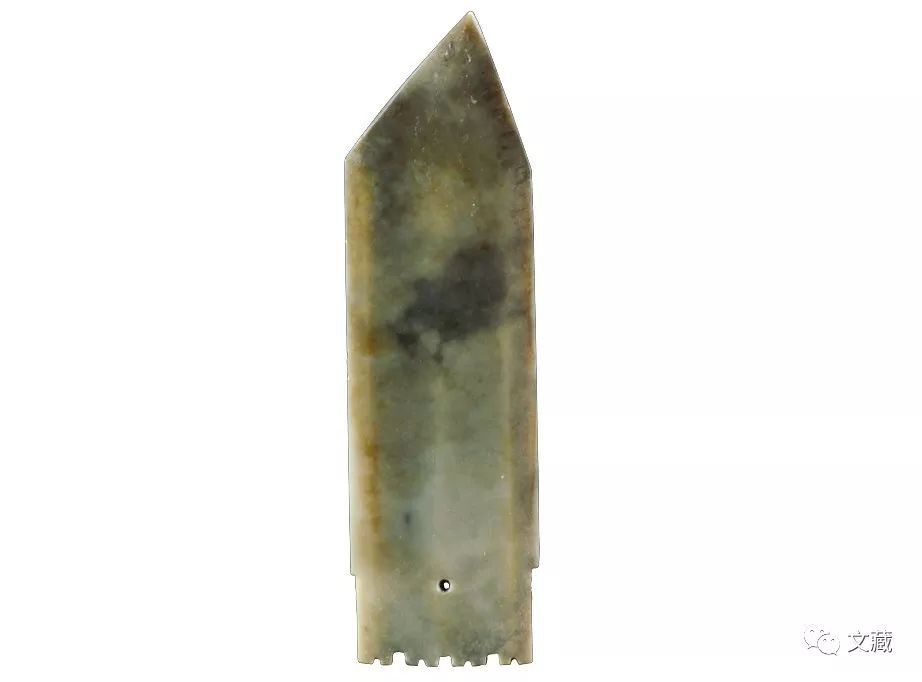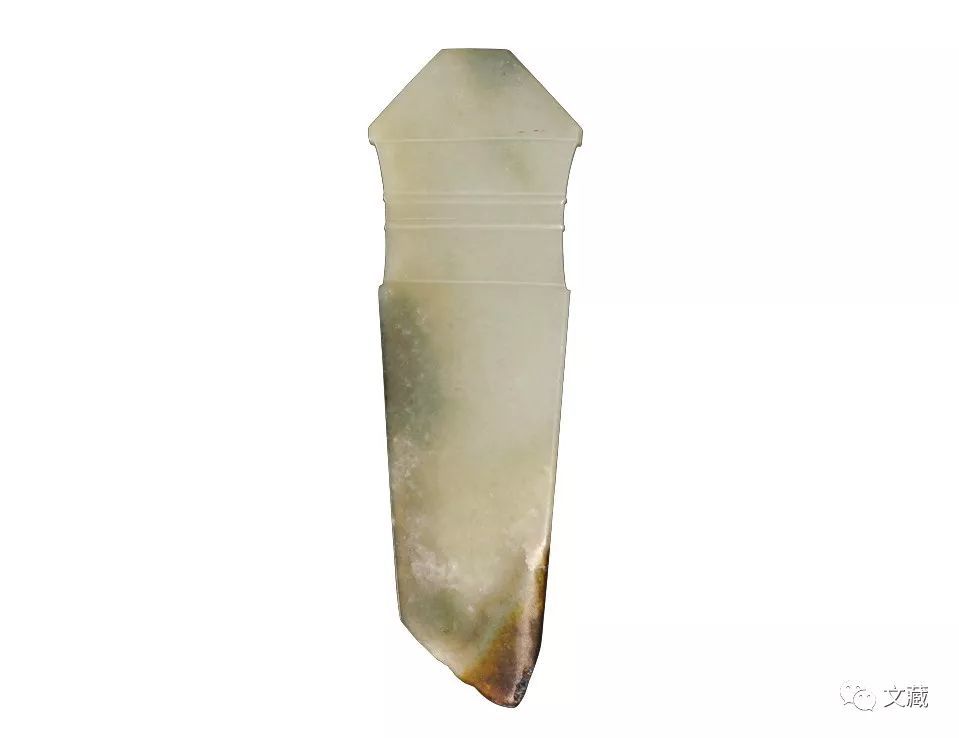 长10.3、宽3.3、厚0.3厘米。青玉,玉质较为温润。局部有沁。宽首梯形,短束颈,颈上有数道凸细线条。短身,两边向下内收。底为斜边尖锋形。长10.3、宽3.3、厚0.3厘米。(图10)