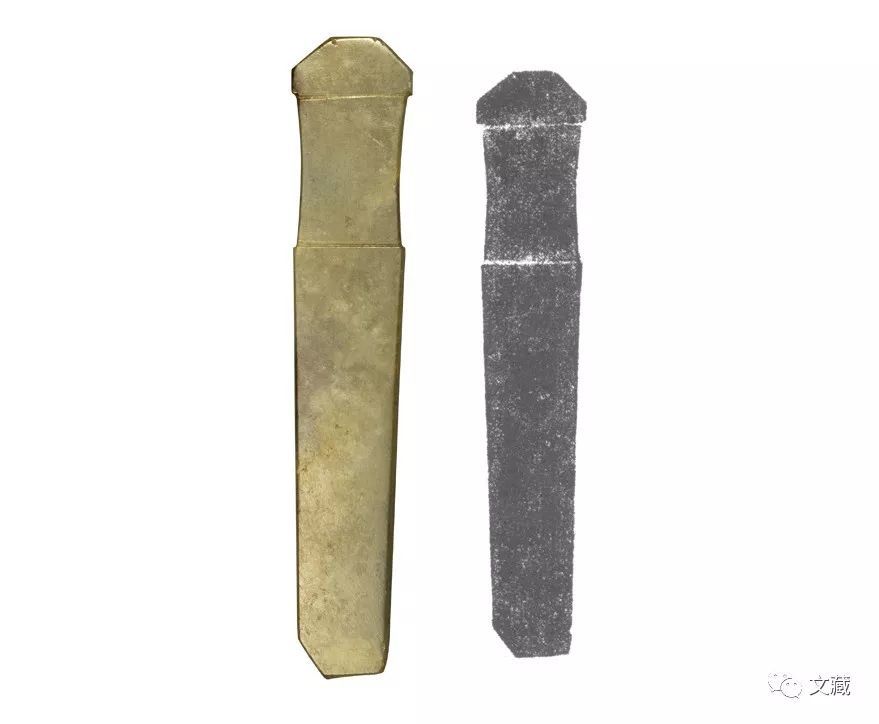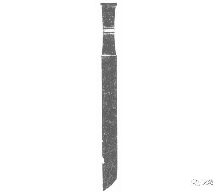 长9.5、宽3、厚4厘米。该器较为厚实,为梯形首,长颈内束,上有数道细凸线。体较长,直边内敛,尖尾似剑锋。(图7)