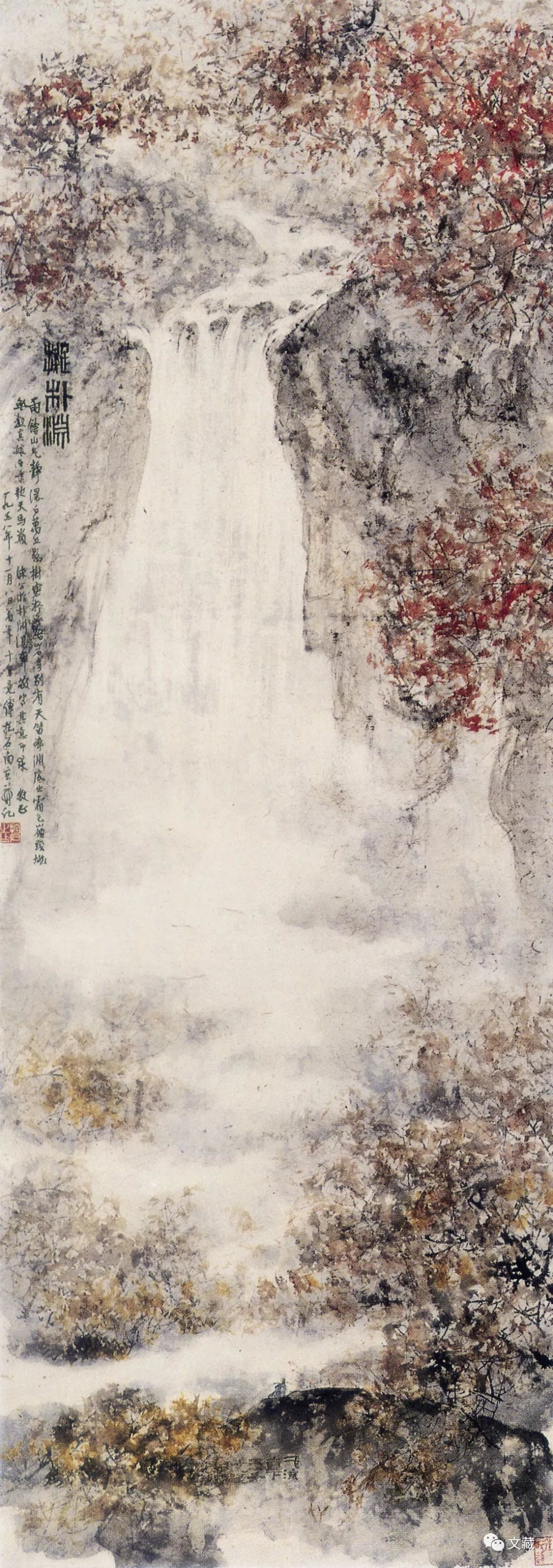 1958年9月,郭沫若率领中国人民代表团访问朝鲜,历时四周,得诗四十八首,至11月6日先后发表于《人民日报》,时正郭沫若寿辰将至。傅抱石即以此创作,十日内先后完成了两件精心之作。其一,《拟〈朴渊〉诗意图》,题识:“拟朴渊。雨余山气静,瀑白万丝悬。树密疑无路,宕奇别有天。笛声渊底出,霜色岭头燃。无数真娘在,啸歌天马巅。沫公游朴渊瀑布,敬写其意,即求教正。一九五八年十一月八日着笔,十日竟,傅抱石南京并记。”