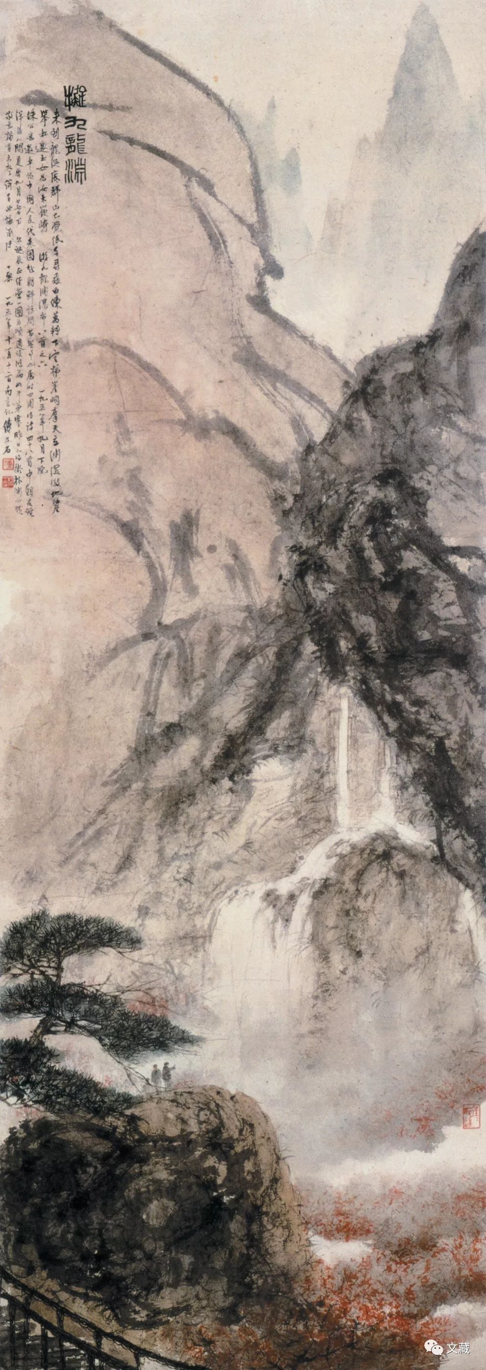 其二,《拟〈九龙渊〉诗意图》,题识:“拟九龙渊。来到龙涎底,群山已觉低。千寻垂白练,万转下云梯。崖峭摩天立,渊深彻地厘。举杯邀玉女,为汝太嵚崎。游九龙渊瀑布八首之六。一九五八年九月下浣,沫公应邀率领中国人民代表团赴朝鲜访问,甚盛事也。历时四周,得诗四十八首,中朝友谊洋溢人间,夏历九月廿七日,乃公诞辰,正经营一图为颂,适读鸿篇,如开茅塞。昨日已得《拟朴渊》小帧,敬意犹有未尽,并呈此幅,谨博一粲。一九五八年十一月十二日,南京记,傅抱石。”
