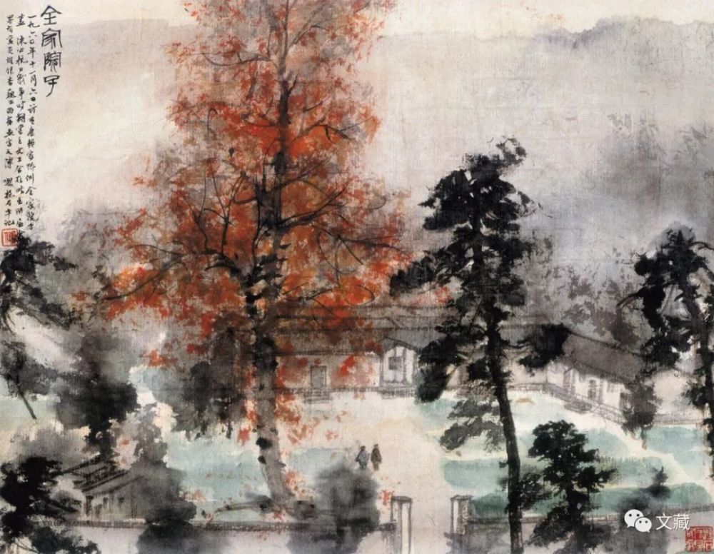 1960年9月,傅抱石率领江苏省国画写生工作团进行万里写生,11月6日参观重庆赖家桥全家院子。傅抱石故地重游,未免慨然。次日,他作成《全家院子》,题云:“全家院子。院子位重庆西郊赖家桥头,抗日战争期间郭老所领导之文化工作委员会所在地也。于时国民党反动派对此备极摧残,幸在党的关怀支持之下,得以坚持。阳翰笙、何成湘两同志实始终其事。每当夏季,文艺工作者多聚于斯。周总理、徐冰同志,苏联费德林博士亦数数莅此。开国后,予曾写一图。昨日特往再访,至则几不能辨,盖已略事改筑,公社农科研究所设于此处,正在建设中也。予徘徊移时,门外小阜之上乃昔日同人种菜地,总理与郭老亦曾畅谈之处也。特收之图中,藉志怀想。出川十有四年,亟为写之。一九六〇年十一月七日革命节,傅抱石重庆并记。”
