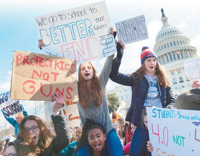 主张枪支自由的利益团体在美国选举政治中举足轻重,特朗普政府依旧囿于利益对控枪态度暧昧引发民众不满。图为2018年3月14日,美国学生在华盛顿游行呼吁加强对枪支管控。 |