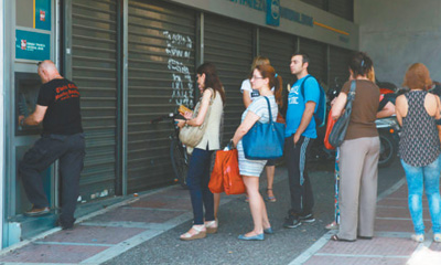 希腊债务危机于2015年大选后急剧恶化,引发国内挤兑“狂潮”。图为2015年7月2日,雅典民众在取款机前排队取钱。 |