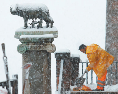 由于当地政府行政效率长期低下难解,经常让意大利首都罗马等地因大雪等突发状况陷入“瘫痪”。图为2018年2月26日,一名清洁工在罗马市政府外清除积雪。 |