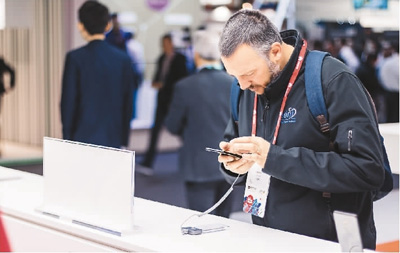 2月26日,2018年世界移动通信大会在西班牙巴塞罗那会展中心开幕。图为国外参会者在中国手机品牌小米的展台前参观体验。智 渊摄 |