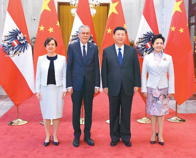 习近平欢迎范德贝伦首次来华进行国事访问并出席博鳌亚洲论坛年会。习近平指出,总统先生率库尔茨总理及多位部长组成的高级别大型代表团访华,在中奥交往史上尚属首次,充分体现了总统本人及奥地利政府对发展中奥关系的高度重视。总统先生还将到中国人民英雄纪念碑前敬献花圈,体现了对中国人民的尊重和友好情谊。奥地利是中国在欧洲的重要合作伙伴。中奥两国都具有悠久历史和灿烂文化,两国人民彼此怀有友好感情。库尔茨总理领导的奥地利新一届政府将积极发展对华关系和“一带一路”倡议首次写入执政协议,中方对此表示赞赏。中方愿同奥方一道,共同挖掘和释放两国合作潜能,播撒更多友谊与合作的种子,更好造福两国人民。