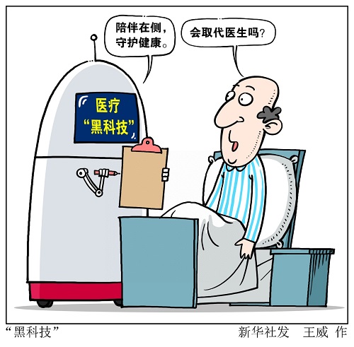 漫画:“黑科技”。跟动画片里一样,萌萌的“大白”陪伴在侧,守护你的健康;部分疾病不需要再去拥挤的医院;哪怕在太空旅行,也可随时远程诊疗;手术中,虚拟现实(VR)技术已经将最复杂的人体变得“可视化”……随着人工智能、机器人、虚拟现实等新技术在医疗领域渐行渐近,上述这些“科幻”场景不再是虚无缥缈。新华社发 王威 作