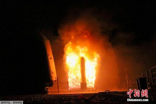 资料图:当地时间2018年4月14日,美国海军公布美国“蒙特利”号导弹巡洋舰发射“战斧”巡航导弹的画面,对叙利亚数个目标实施打击。