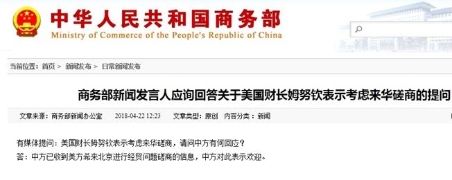 美财长姆努钦考虑来华磋商 中方表示欢迎 2018-04-22 20:37 来源:未知 作者: 一叶知秋 字号: 据商务部网站消息,有媒体提问:美国财长姆努钦表示考虑来华磋商,请问中方有何回应?答:中方已收到美方希来北京进行经贸问题磋商的信息,中方对此表示欢迎。 责任编辑: 修己 相关阅读 关键词: 复制网址 打印 收藏