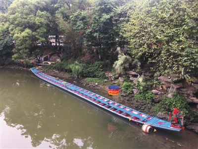 昨日,距翻船事故发生地百余米外,一艘龙舟停在桃花江边。