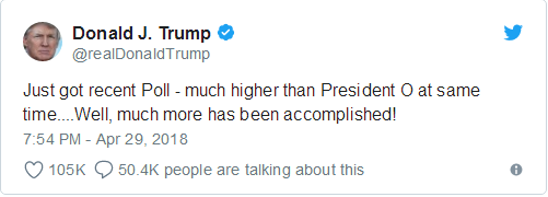 特朗普称,“刚得知最新的民调结果,与奥巴马执政同期相比,我(的民调结果)高多了。而我完成的(事情)也更多!”