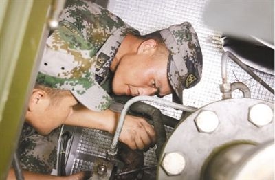 吴勇(右)和战友一起维修受损的输油泵。 |