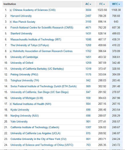 此次共有16家中国科研机构和高校进入全球总排名前100位,比上一年增加3家。除中科院外,还包括北京大学(12)、清华大学(13)、南京大学(19)、中国科学技术大学(24)、中国科学院大学(31)、浙江大学(42)、复旦大学(55)、上海交通大学(58)、南开大学(67)、厦门大学(70)、中科院化学研究所(73)、苏州大学(75)、武汉大学(76)、中山大学(81)、兰州大学(98)。在针对全球高校的排名中,中国科学技术大学位列第19位,中国科学院大学位列第26位。