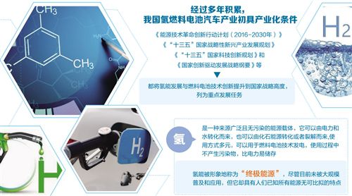 经过多年积累,我国氢燃料电池汽车产业初具产业化条件。《能源技术革命创新行动计划(2016-2030年)》《“十三五”国家战略性新兴产业发展规划》《“十三五”国家科技创新规划》和《国家创新驱动发展战略纲要》等都将氢能发展与燃料电池技术创新提升到国家战略高度,列为重点发展任务。尤其是在2019年,我国第一次将氢能相关内容纳入《政府工作报告》,表明国家将更加重视氢能发展。地方政府积极探索实践,制定地方规划和扶持政策,建设氢能小镇或产业园区,形成以北上广为中心的京津冀、长三角、珠三角三大氢能产业先发区域。