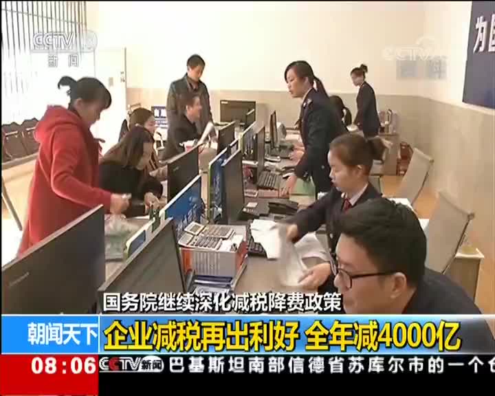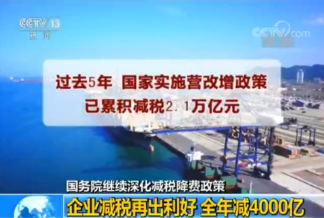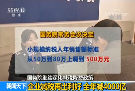 央视网消息:昨天(28日),国务院常务会议再次推出3项举措,继续深化减税降费政策,预计全年将减轻企业税赋超过4000亿元,内外资企业同等受益。