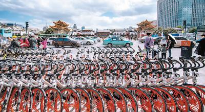 图为位于昆明市三市街与金碧路交叉口的共享单车临时停放点。