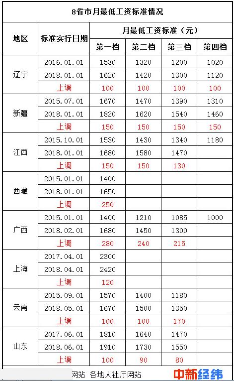 最低工资标准调整与失业人员、带薪休假劳动者、医疗期员工等人员的收入紧密相联,据中新经纬客户端(微信公众号:jwview)不完全统计,截至4月25日,已有辽宁、新疆、江西、西藏、广西、上海、云南和山东8省市上调2018年最低工资标准。公开资料显示,广东、四川、安徽也将上调。目前来看,上海月最低工资已达2420元,在各省市中最高。