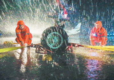 8月10日晚间,江苏省扬州泰州国际机场,春秋航空地勤人员对驻场飞机进行固定,确保飞机不被台风吹移。 |