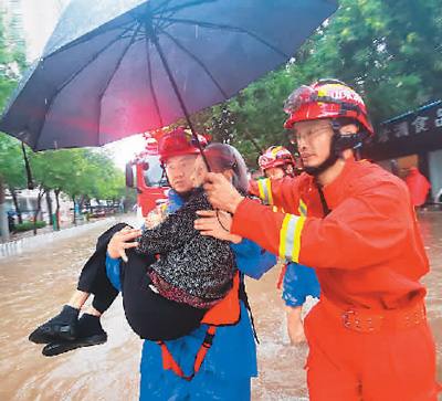 8月11日,救援人员在山东省滨州市滨城区一积水路段救助被困车内的九旬老人。 |