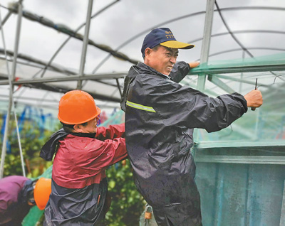 12日,宁波象山县青山头村组织村民抢修受损的大棚。 |