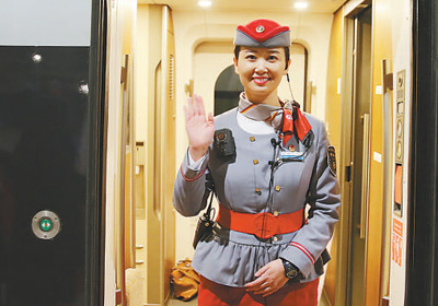 青岛北高铁站,列车员在出发前向人们挥手致意。 |