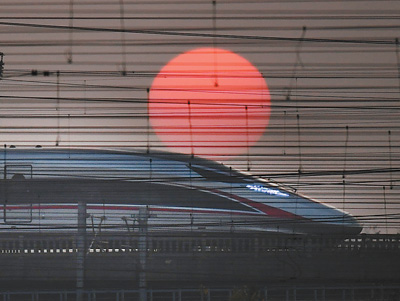 夕阳下,“复兴号”高速列车从武汉动车段旁经过。 |