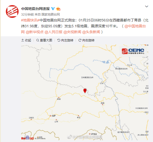 西藏昌都市丁青县发生5.1级地震 震源深度10千米 2020-01-25 08:32 来源:人民网 作者: 人民网 字号: 人民网北京1月25日电 中国地震台网正式测定:01月25日06时56分在西藏昌都市丁青县(北纬31.98度,东经95.09度)发生5.1级地震,震源深度10千米。 责任编辑: 修己 相关阅读 关键词: 复制网址 打印 收藏