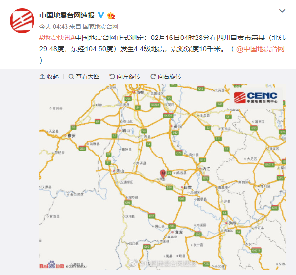 四川自贡市荣县发生4.4级地震 震源深度10千米 2020-02-16 09:17 来源:人民网 作者: 人民网 字号: 人民网北京2月16日电 中国地震台网正式测定:02月16日04时28分在四川自贡市荣县(北纬29.48度,东经104.50度)发生4.4级地震,震源深度10千米。 责任编辑: 修己 相关阅读 关键词: 复制网址 打印 收藏